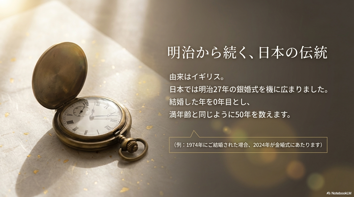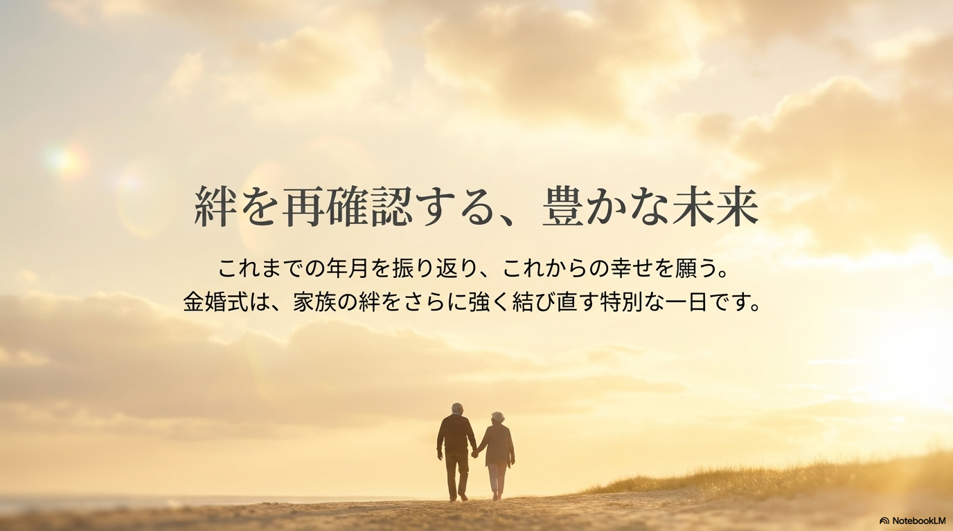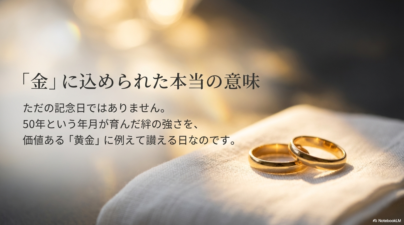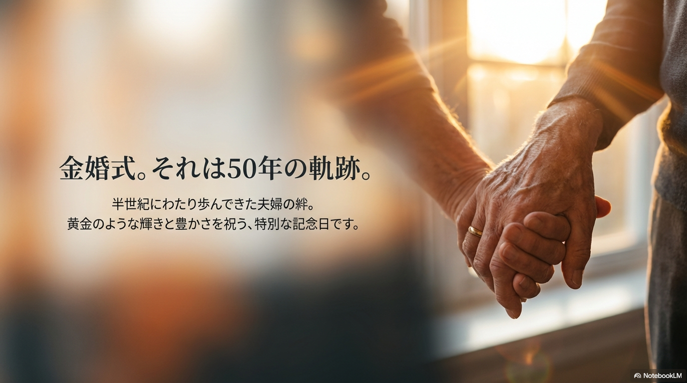 金婚式(きんこんしき)は、結婚50周年を祝う特別な記念日です。半世紀にわたり歩んできた夫婦の絆を、黄金のような輝きや豊かさにたとえて祝います。