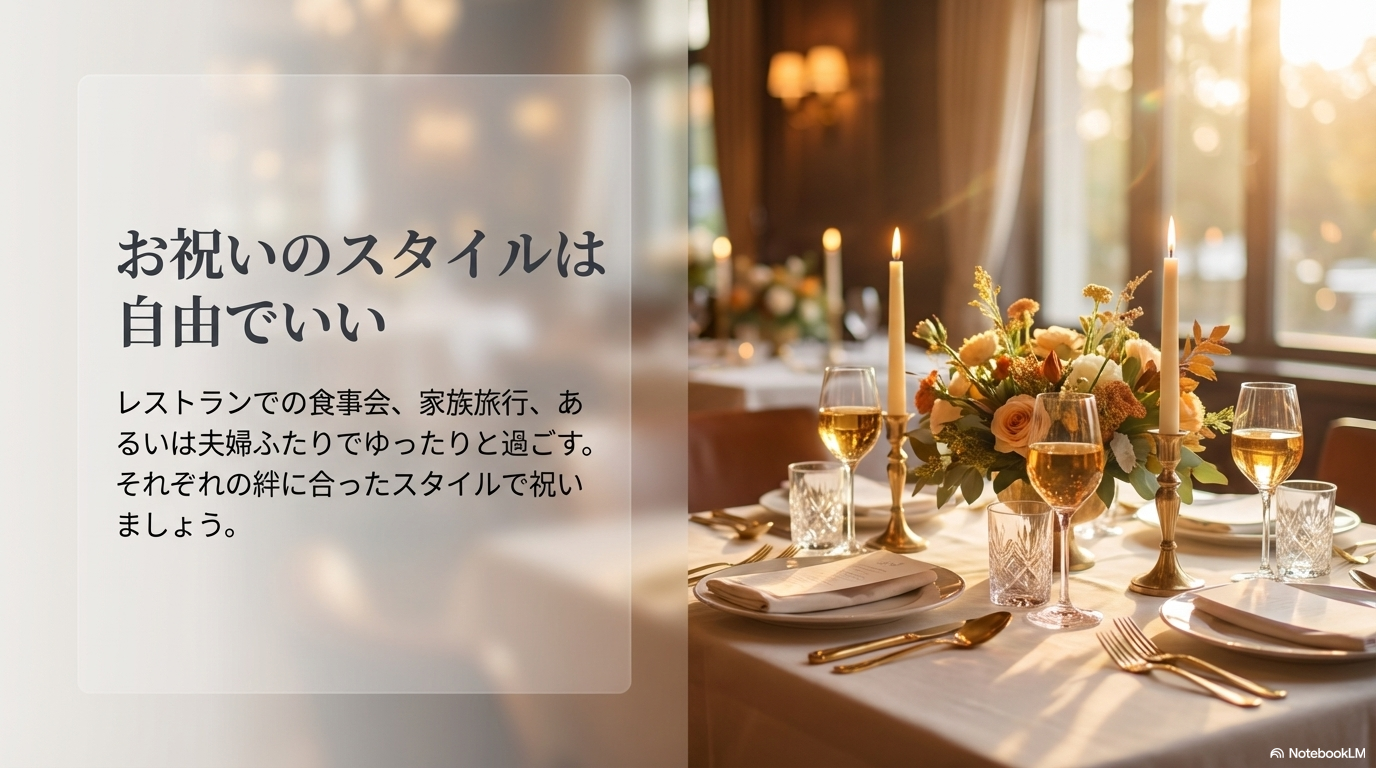 一方で、夫婦ふたりで旅行や食事を楽しみ、ゆったりと過ごすケースもあります。友人を招いて賑やかに祝うこともあり、スタイルはさまざまです。