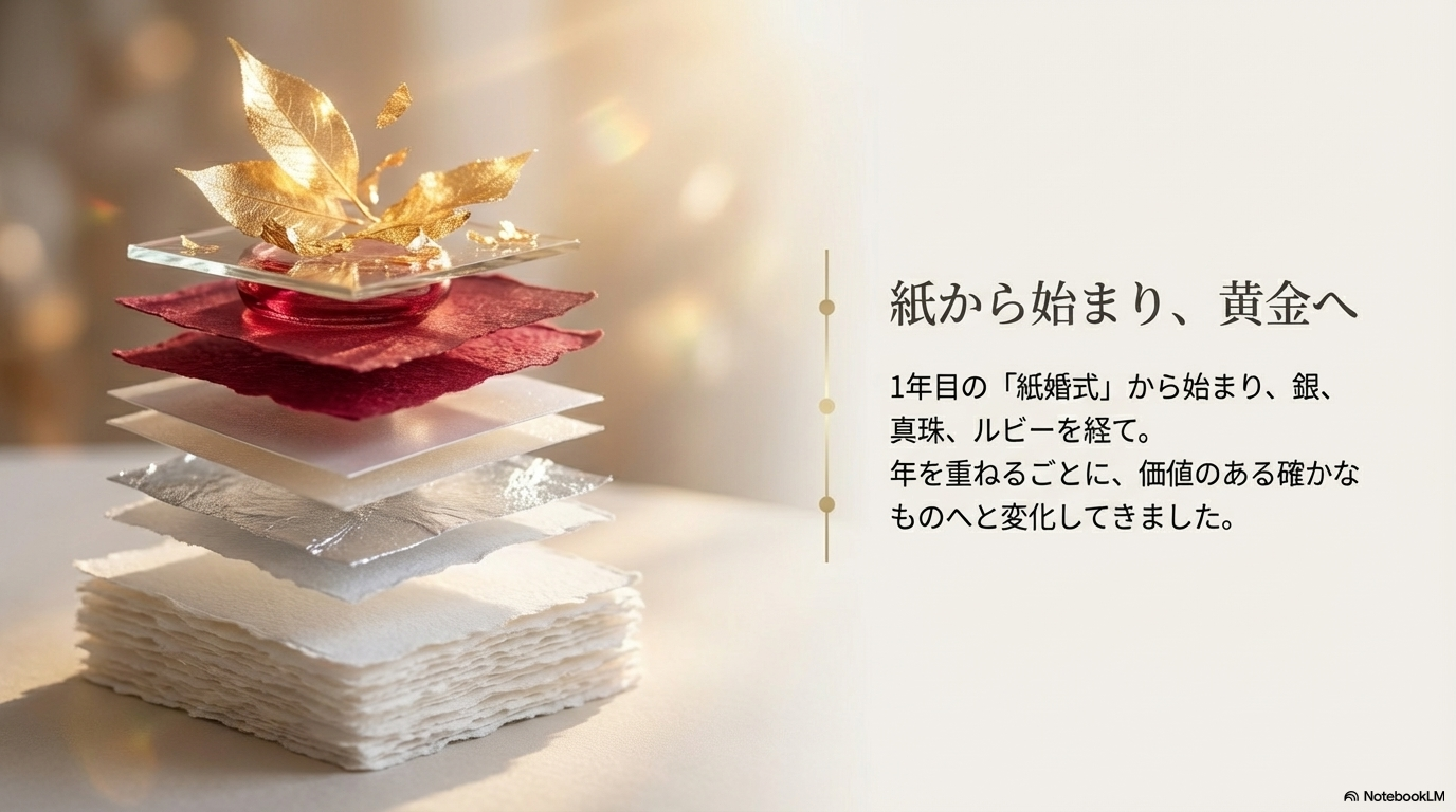 これまでの年月を振り返り、これからの幸せを願いながら、夫婦で改めて絆を確かめ合う機会としても大切な一日です。