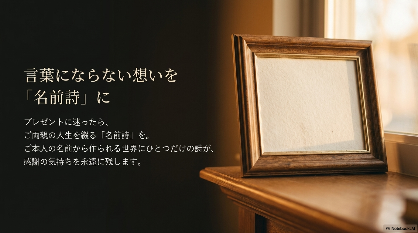 名前詩は、ご本人の人生やご家族の想いを短い詩として表現する特別な贈り物です。
