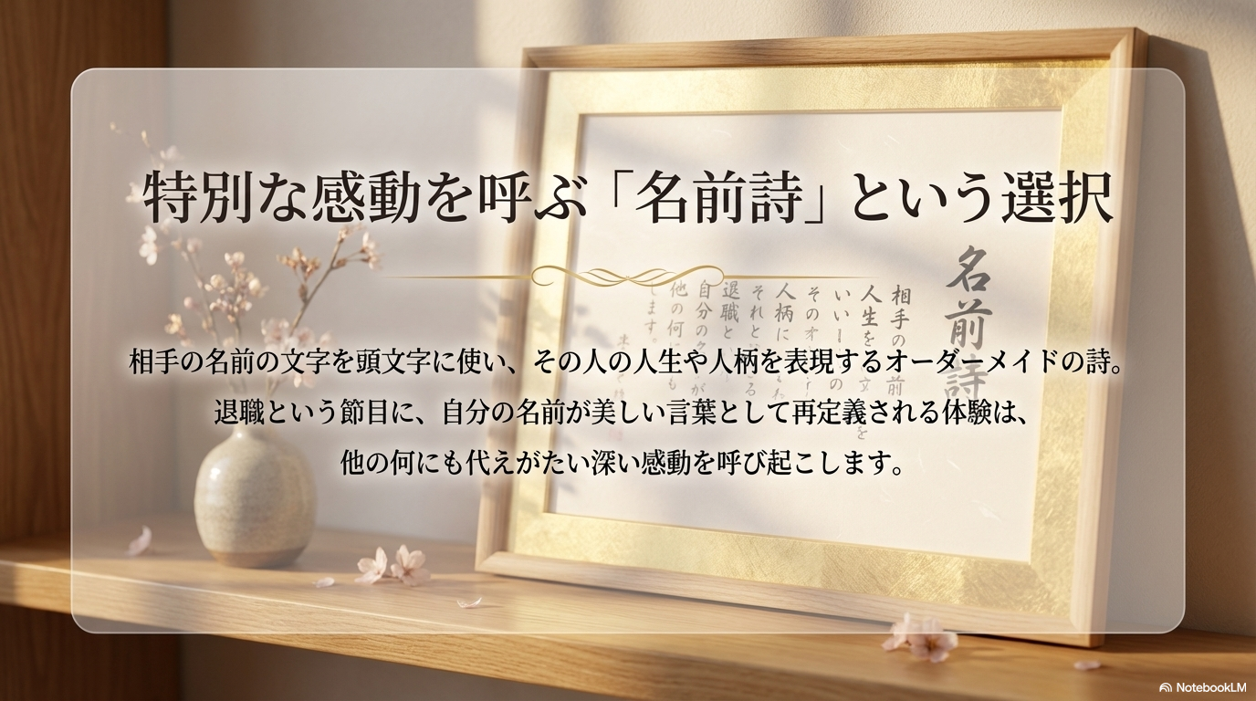 名前詩とは、相手の名前の文字を頭文字に使い、その方の人生や人柄を表現した詩を作成するオーダーメイドの贈り物です。既製品とは異なり、その方のためだけに紡がれた言葉は、他の誰にも代えがたい特別な価値を持ちます。退職という人生の大きな節目において、自分の名前が美しい言葉として再定義される体験は、深い感動を呼び起こします。
