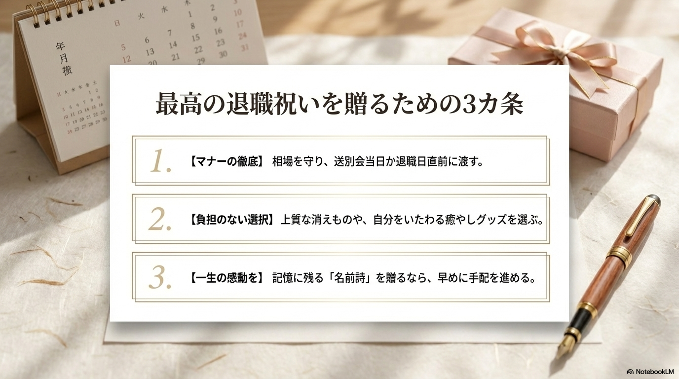 また、渡すタイミングも非常に大切です。正式な辞令が出る前に贈るのは、早く辞めてほしいという誤解を招く恐れがあるため控えてください。送別会当日か、退職日の1週間前から前日までに渡すのが最もスマートな振る舞いです。退職当日は持ち帰る荷物が多くなることも考慮し、大きな品物を贈る場合は自宅へ直接配送する手配を整えるなどの配慮が求められます。