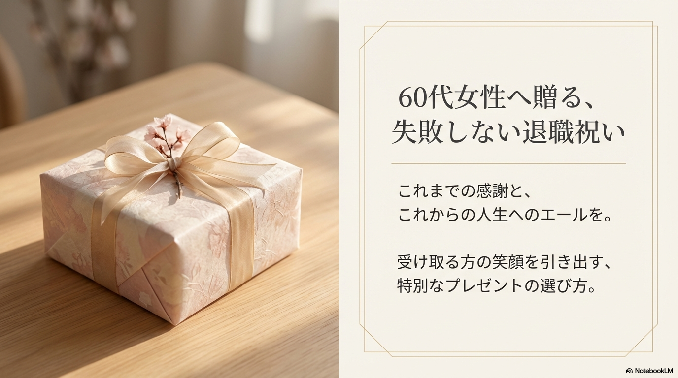 60代で退職を迎える女性への贈り物は、これまでの感謝とこれからの人生を応援する大切な節目となります。退職祝いのプレゼントを女性の60代に贈る際、何を基準に選べばよいのか迷う方も多いでしょう。相手に喜んでもらいたい一方で、マナー違反や失敗による後悔は避けたいものです。
