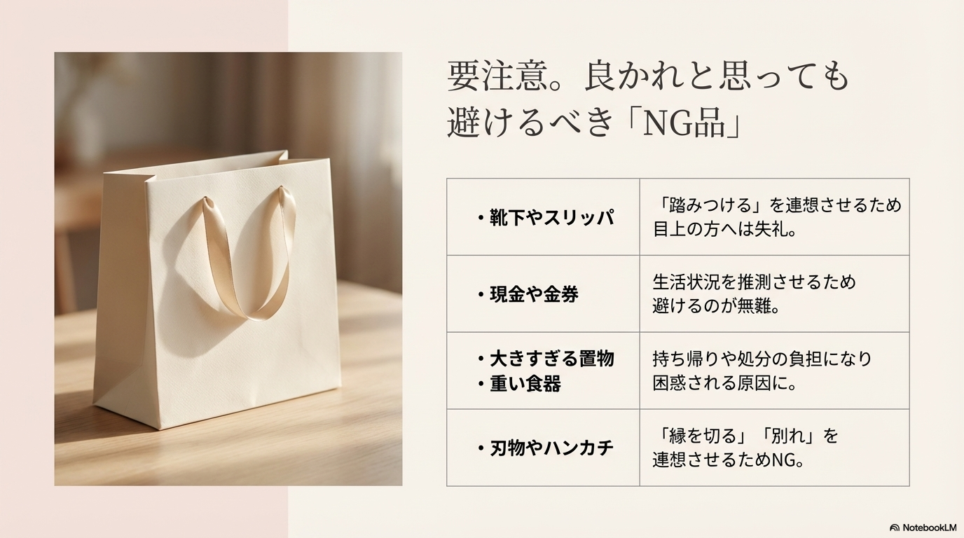 - 履物や現金などのマナー違反となるNG品目は避けるのが鉄則