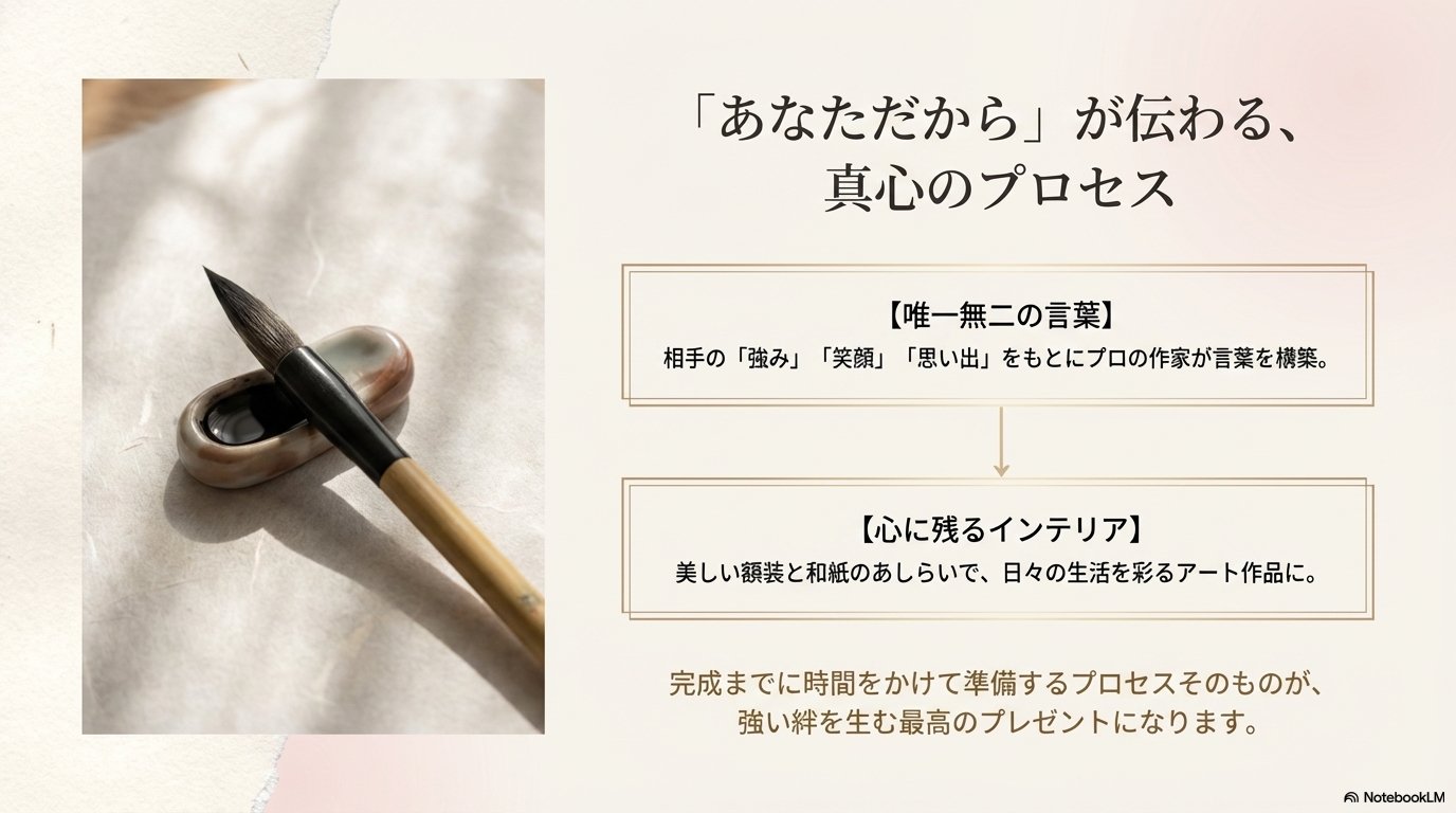 オーダーメイドのギフトには、制作過程に時間がかかるからこそ伝わる真心の重みがあります。既製品を店舗で購入するのとは異なり、事前に相手のことをリサーチし、作家とやり取りを経て完成させるプロセスそのものが、最高のプレゼントと言えます。実際、名前詩を受け取った方の多くが、自分の名前が大切に扱われていることに深い喜びを感じるというデータもあります。